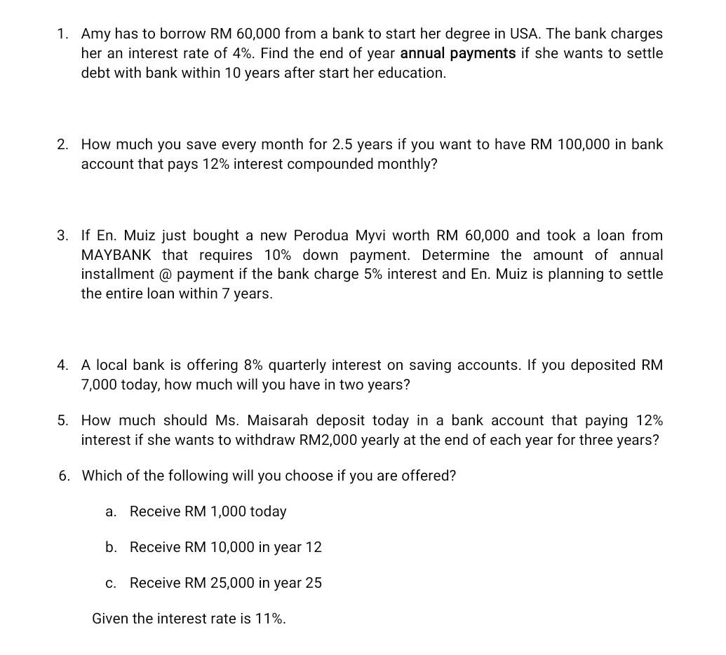 Solved 1 Amy Has To Borrow Rm 60 000 From A Bank To Start Chegg Com